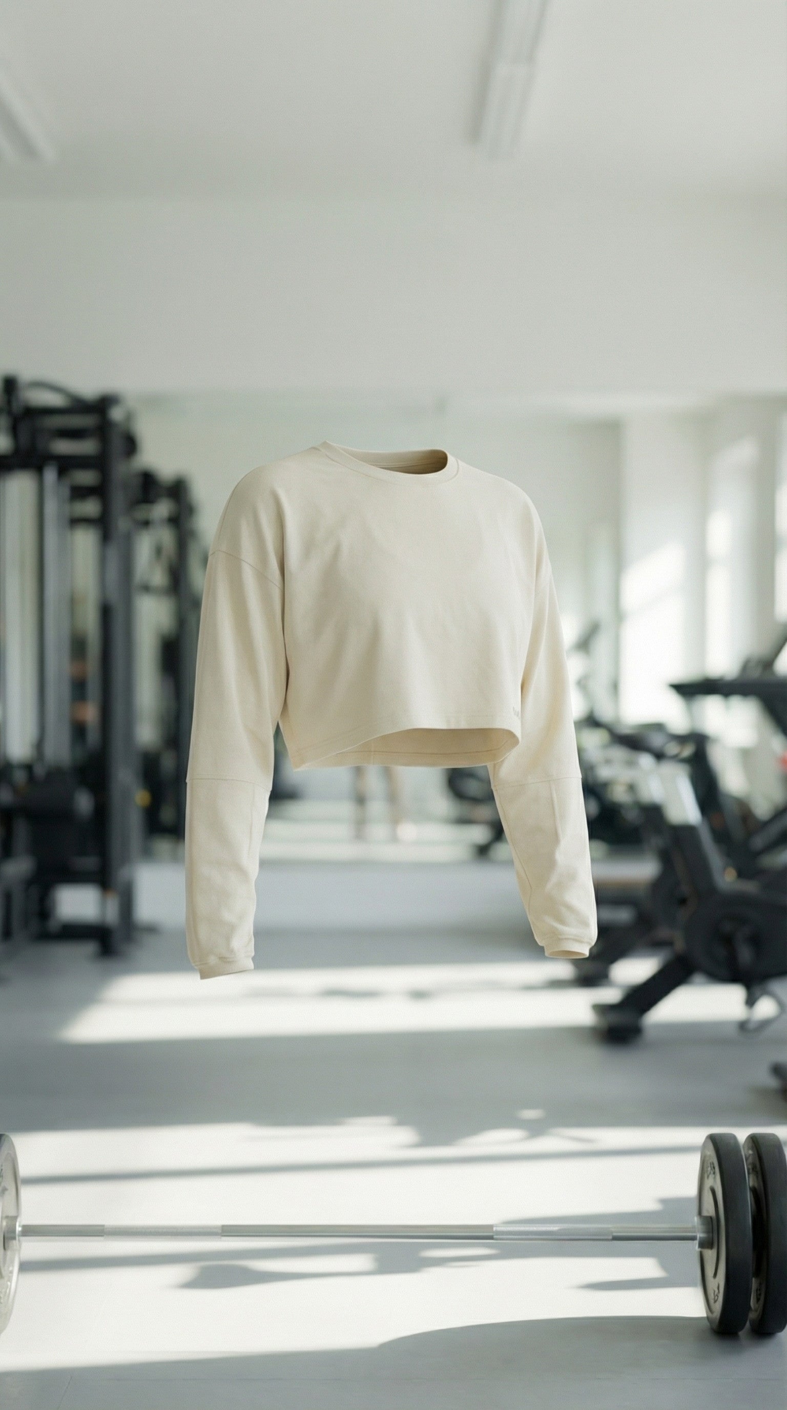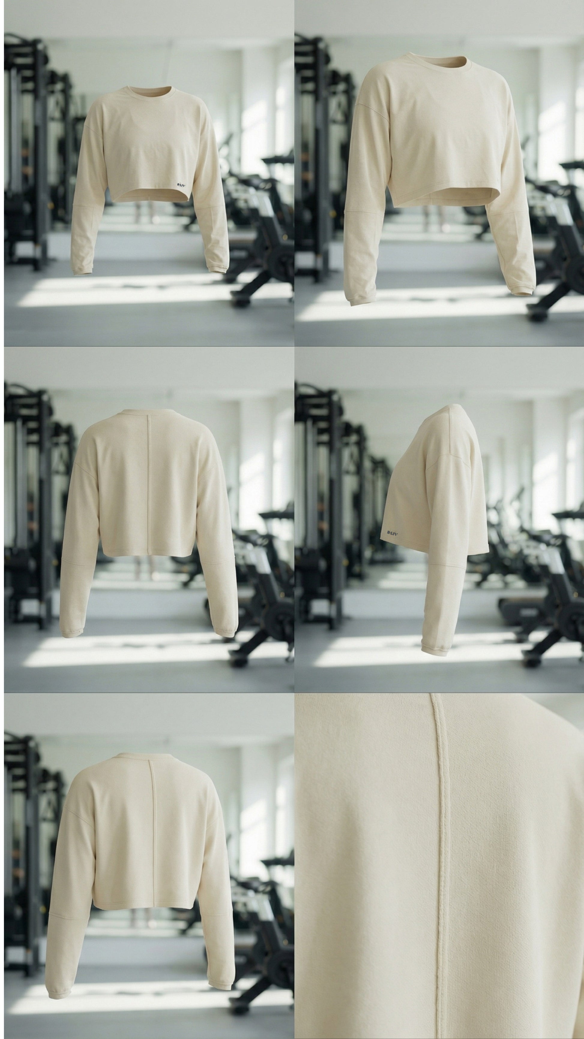 חולצת קרופ ארוכה בצבע אבן עם צווארון עגול ושרוולים רחבים.